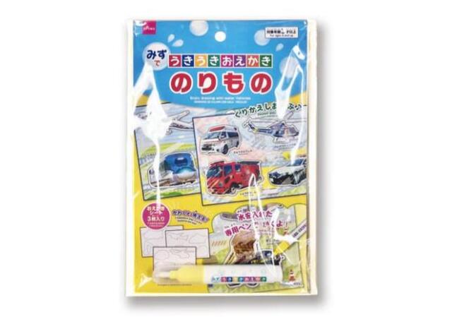 水にぬれると乗り物のイラストが浮き出てくるおもちゃです。付属のペンに水を入れて、塗り絵のように使えます。