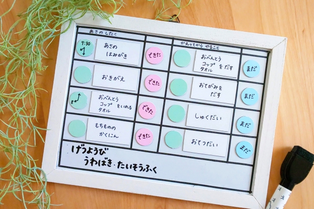 など、次にすることを写真やイラストで確認することができます。また、「自分でできた!」という達成感にも繋がります。我が家も最初は一緒に確認をしていましたが、途中からは一人でボードを見ながら動けるようになりました。