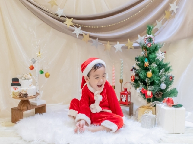 大きな赤い帽子やプレゼント袋にきっと興味津々になり、写真を撮るだけでも家族の良い思い出になります。