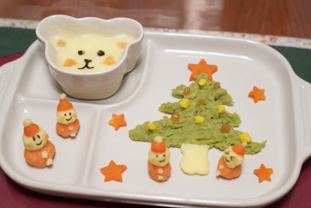 おかゆやマッシュポテトを土台にして、その上に赤や緑の黄色などの野菜ペーストでツリーやリースを描きます。手軽に作ることができて、写真を撮っても可愛い一品です。